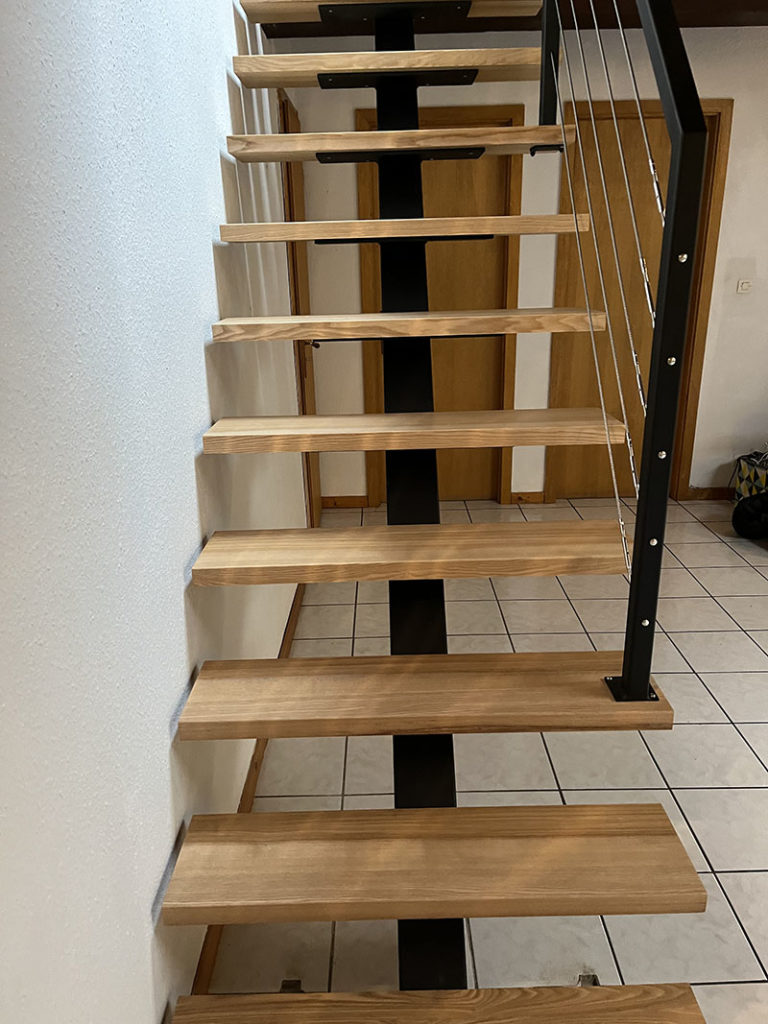 Vous avez la possibilité de commander votre escalier avec ou sans marches. Nos marches en bois sont réalisées en frêne olivier massif, pour une qualité et un rendu esthétique supérieur.